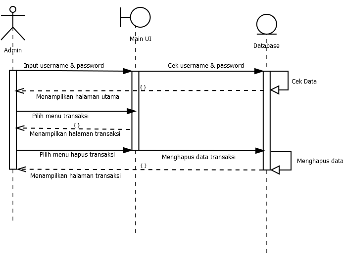 Untuk menghapus data transaksi, Admin akan memasuki halaman transaksi dan mencari data transaksi yang ingin dihapus. Admin dapat memilih menu hapus transaksi untuk menghapus data, maka data transaksi tersebut akan secara otomatis terhapus pada database.
